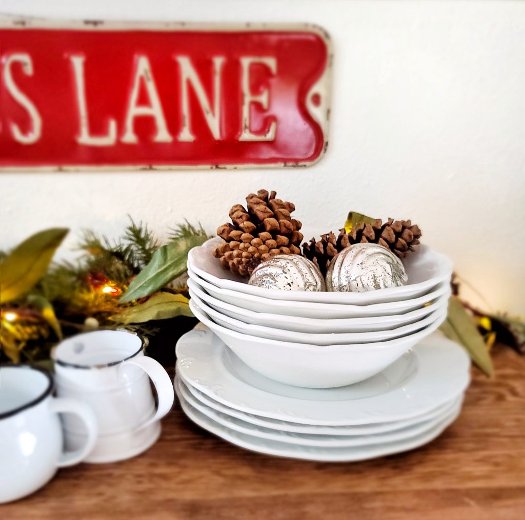 Open shelving in the kitchen is my favorite place to decorate for Christmas. I displayed my white ironstone with greenery, berries, and pinecones mixed in.
