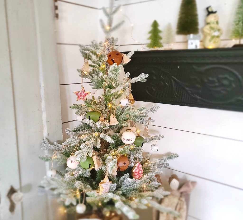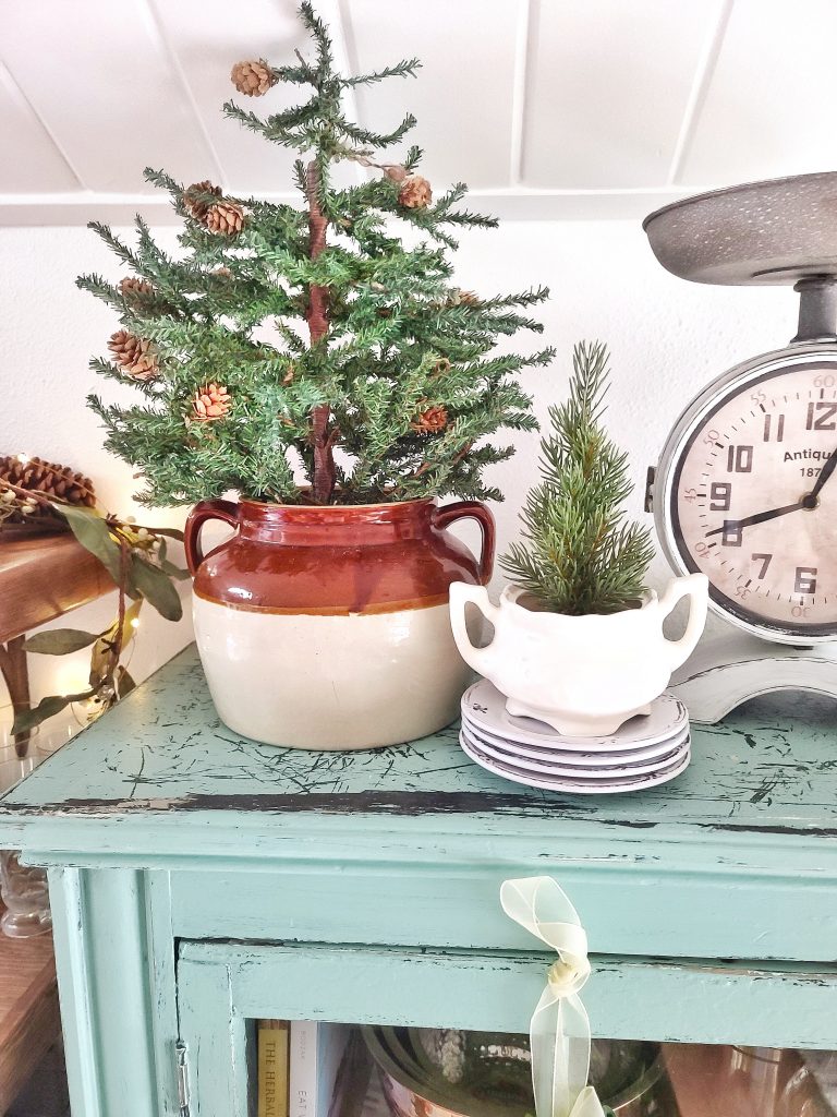 A tree in a crock is perfect for a cottage Christmas kitchen.