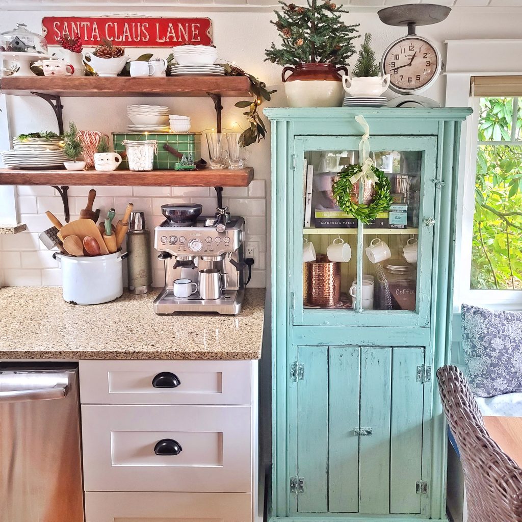 Your have added just the right amount of Christmas to your cozy cottage! I love the how you have used several small trees here and there, and all the adorable touches in the kitchen. The seasonal fruits and nuts are so pretty too! My favorite touch is the little wreath on the chippy teal cabinet. Love it!