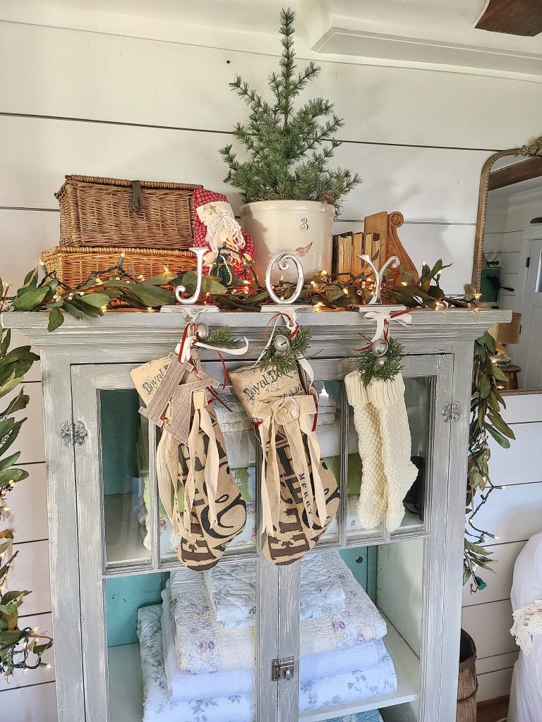 We don’t have a mantel in the living room, so I use the glass cabinet to hang the stockings carefully.