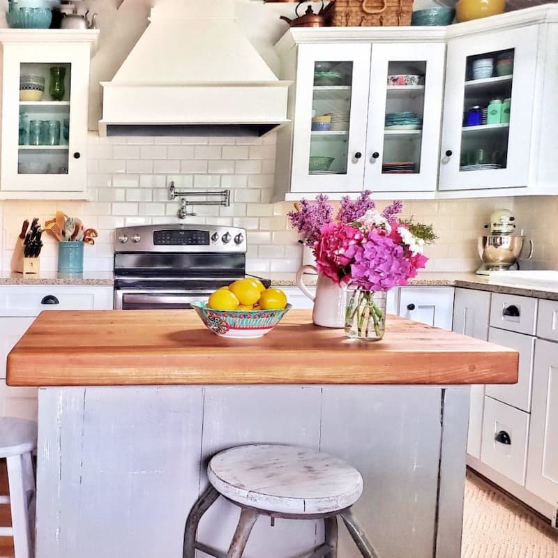 There are some really personal touches in this space that still make me smile. The kitchen island? It’s made from an old dresser we repurposed and topped with a piece of butcher block salvaged from a closing Dunkin’ Donuts (yes, really!).