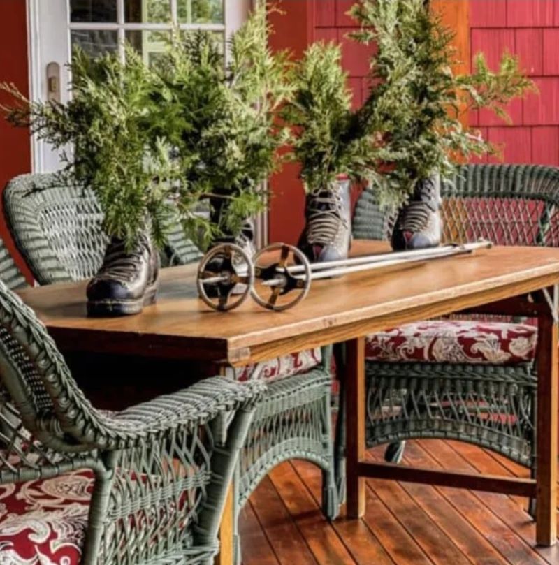 Hang a pair of skates or snowshoes by the door for a cozy winter look. I like to tuck in sprigs of greenery and ribbon for a festive touch.