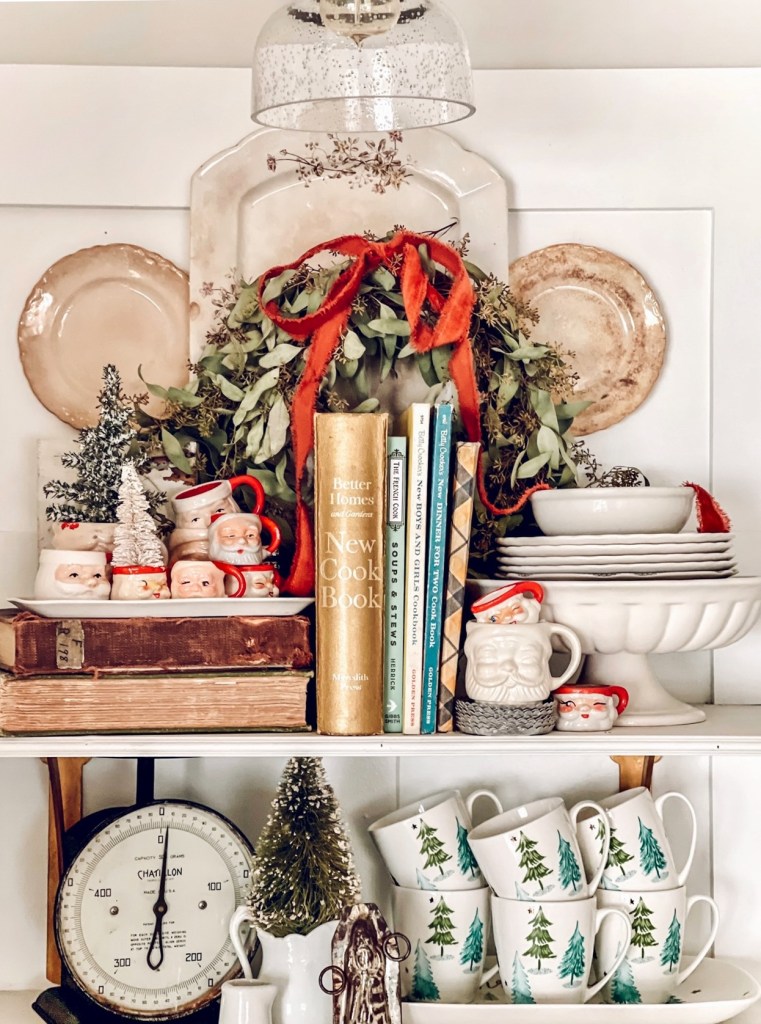 You can never have too many Santa mugs. I mix old and reproduction styles, and they’re one of my favorite ways to decorate the kitchen for the holidays. They’re cheerful, nostalgic, and perfect for hot cocoa nights.