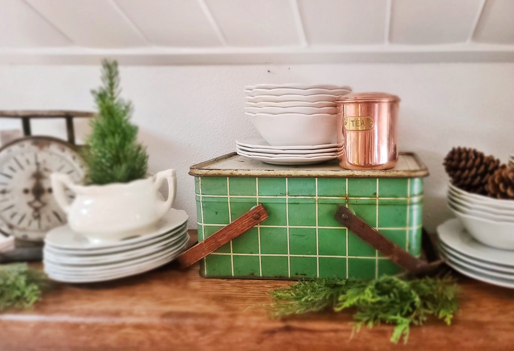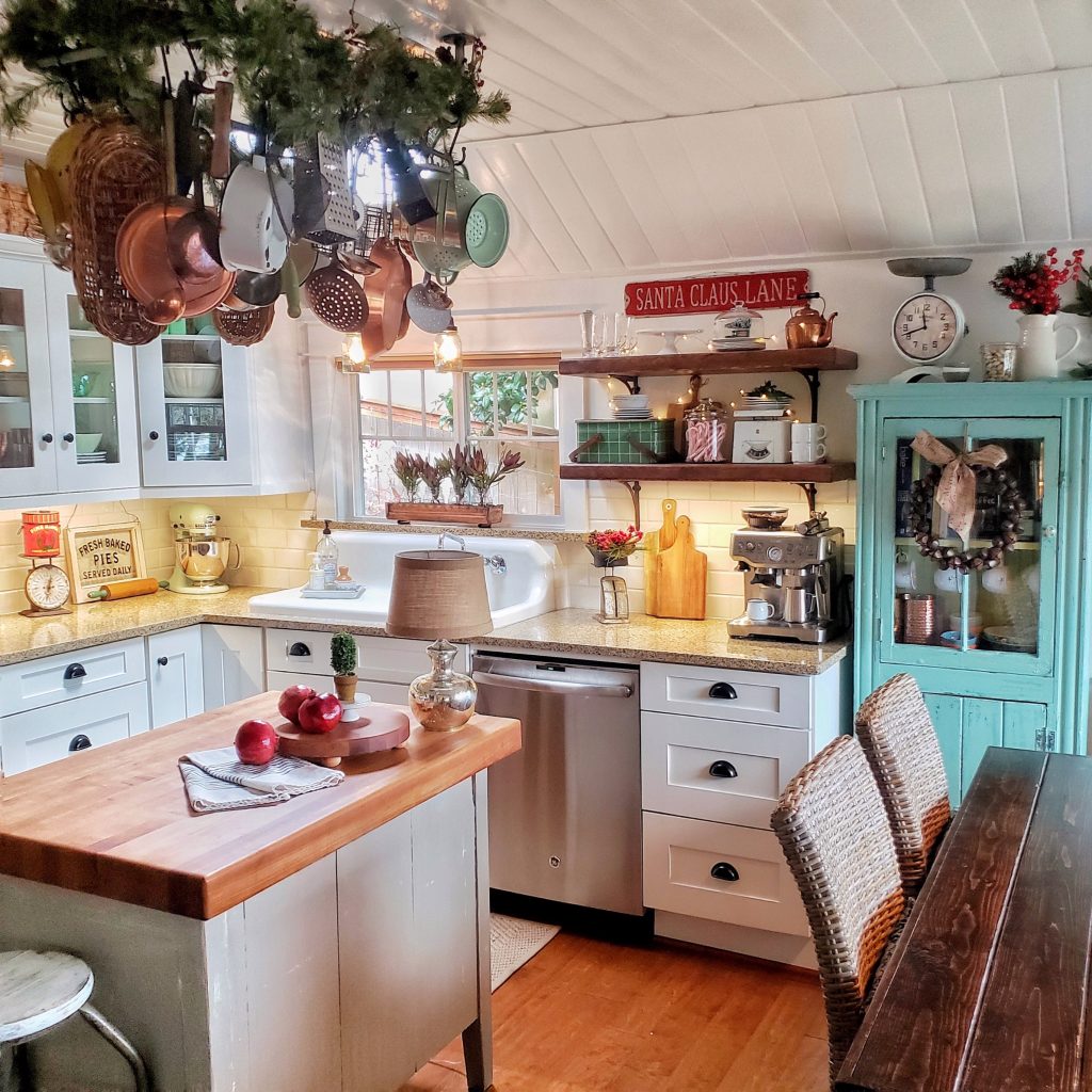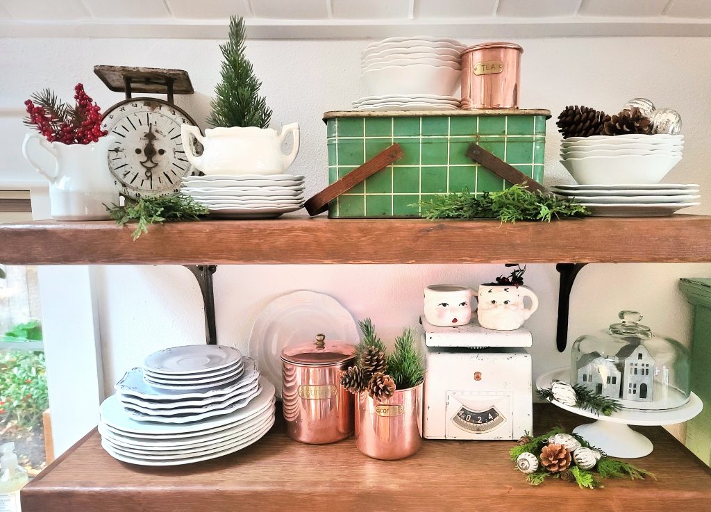 Start with something simple: add greenery, pinecones, and jars of candy canes or cocoa mix to your open shelves. I love mixing in vintage Santa mugs, ironstone dishes, and a few festive pops of red.