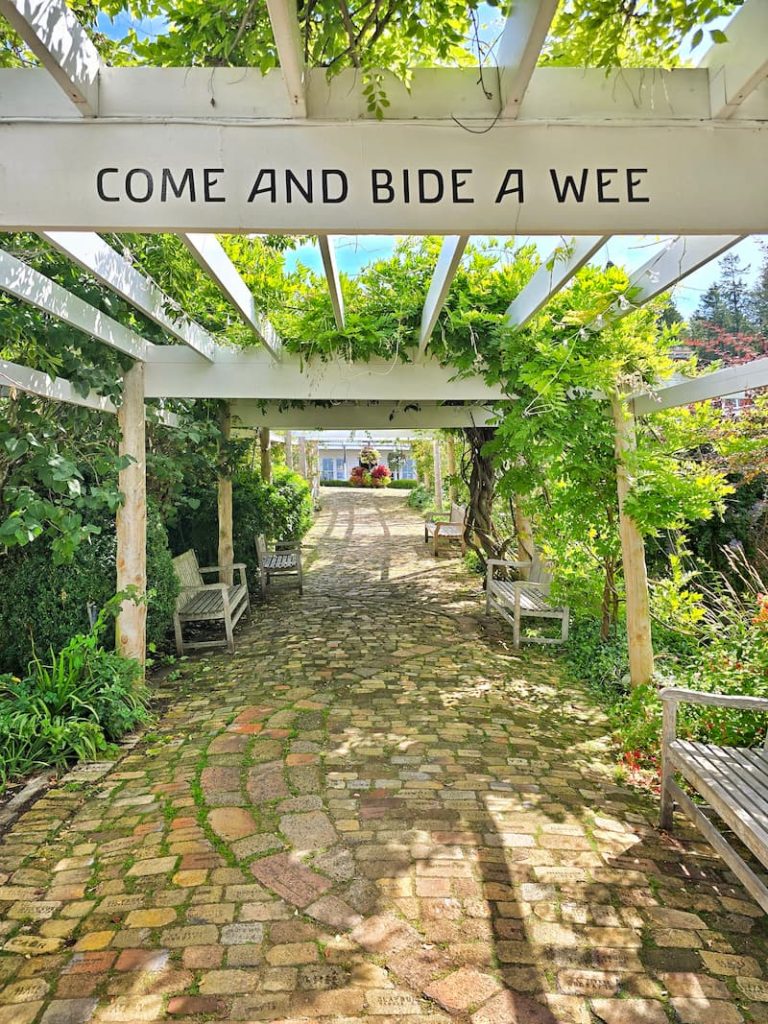 There’s a sweet arbor at the garden’s edge with a hand-painted message bidding farewell to those heading out by boat.