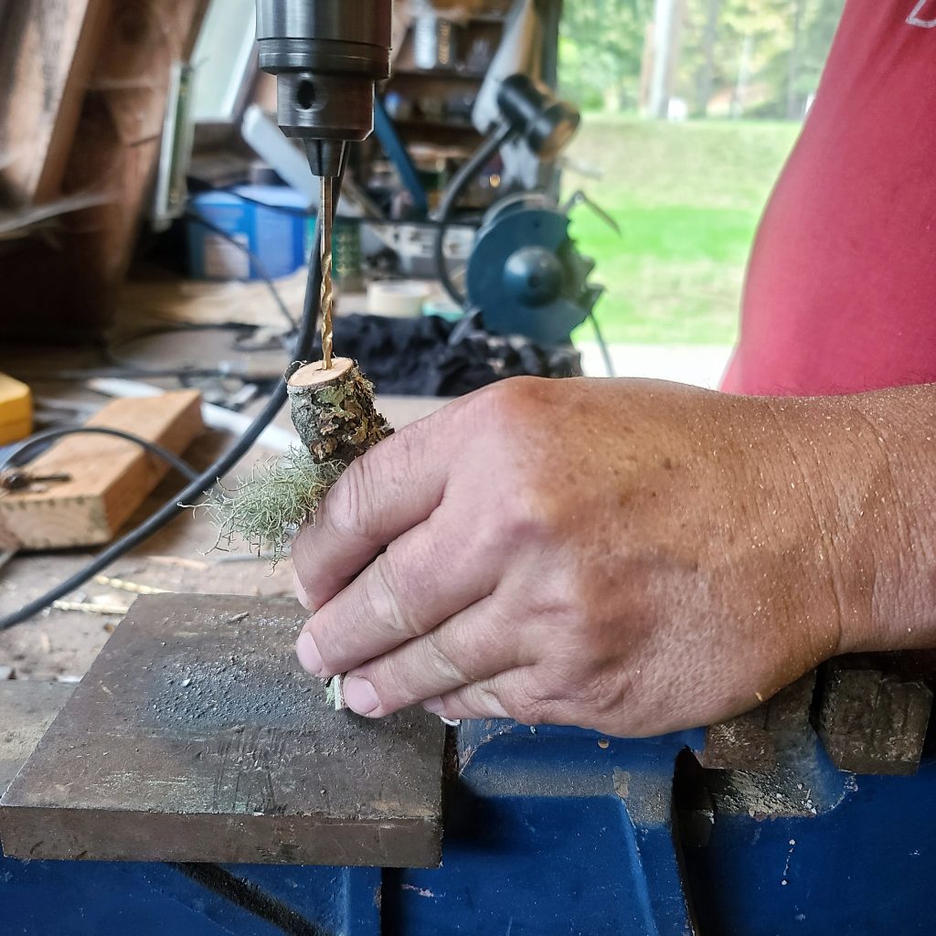 Drill a hole into the top of the pumpkin at the angle you want the stem to sit.