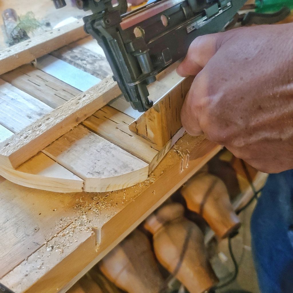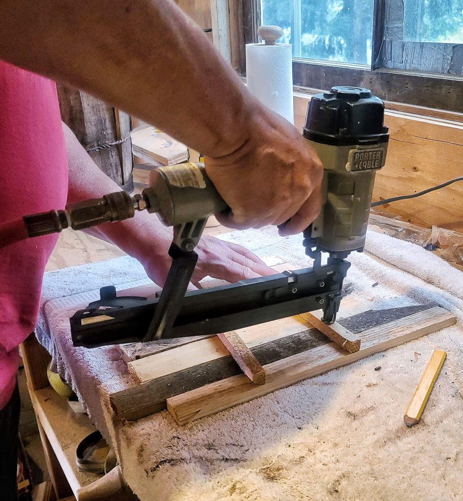 Using a nail gun, nail the support boards to the pumpkin strips. This will keep the boards in place while the glue dries.