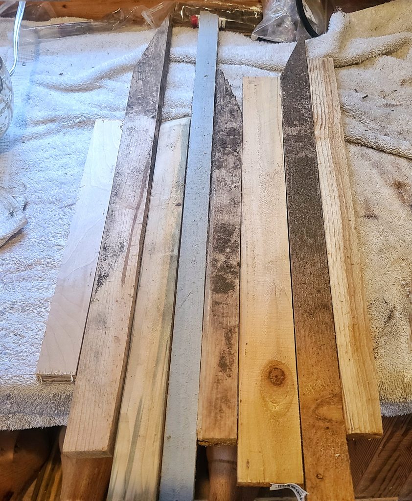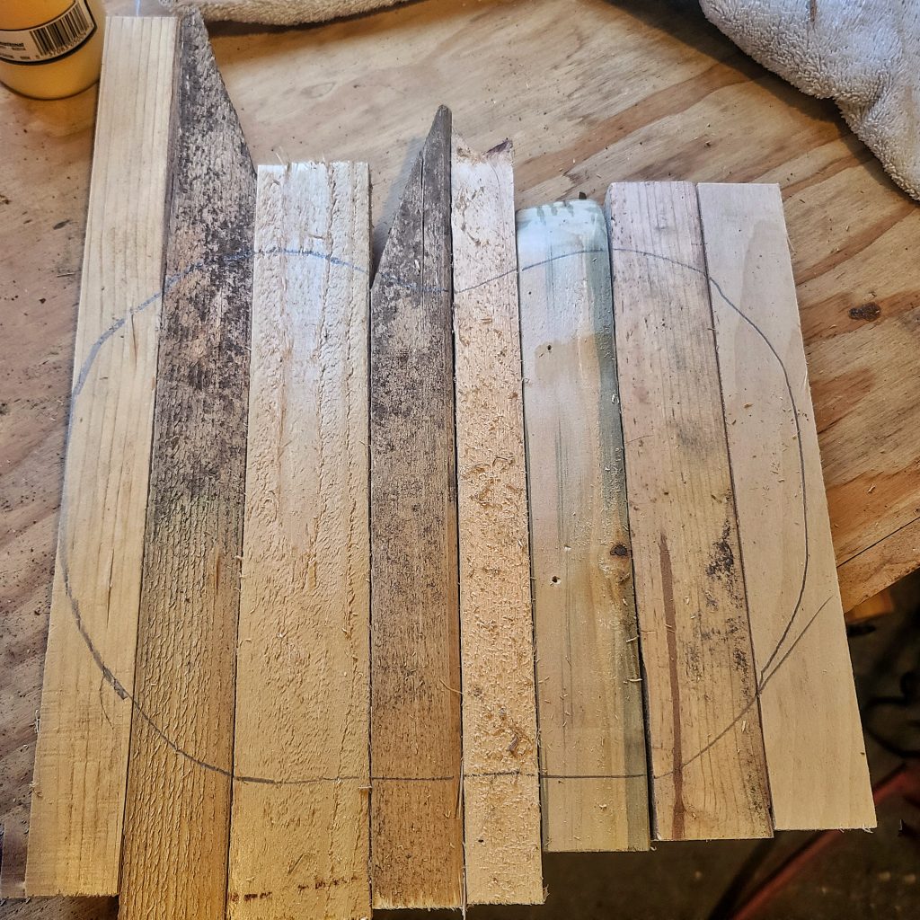 Gather old 1″ x 2″ scraps of wood (I used wood stained from dirt and water in the garden). Lay down the wood strips to approximate the size of your pumpkin.