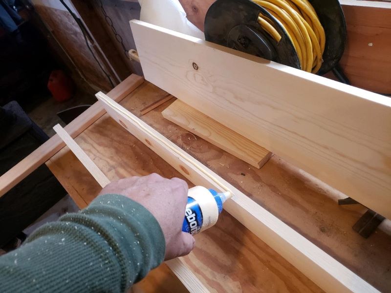 Apply glue to the edge of the 1″x 4″ legs, and lay a 1″x 6″ face board on top of the legs, nailing them down.