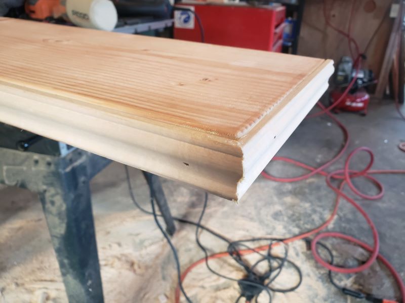 After cutting to size, wrap the face of the mantel shelf with 2″ baseboard molding.