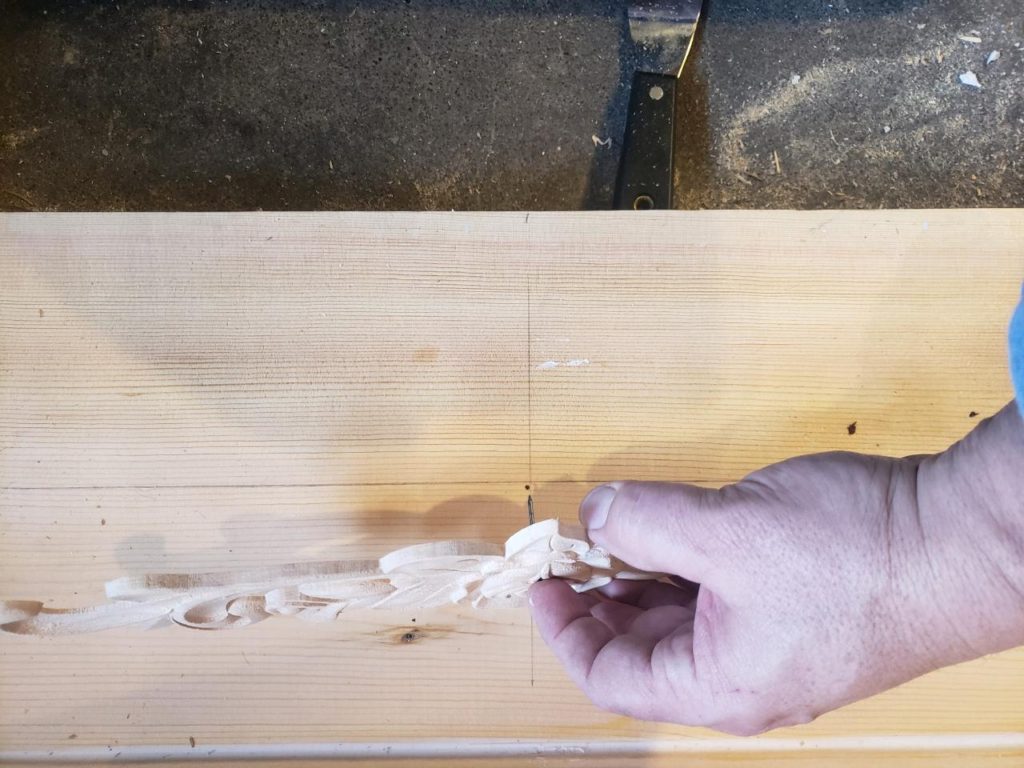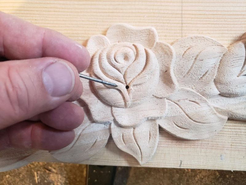 Find the center of the apron board. Use a nail, tapping gently, to hold the applique in place. Apply glue, and hold it in place with masking tape until dry. At that time, remove the nail.