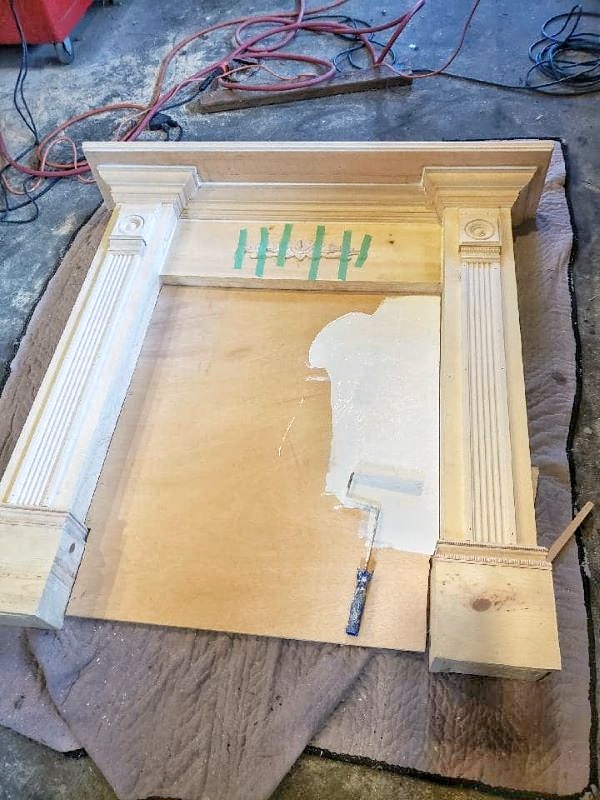 To keep the rest of the room clean, we decided to build our fireplace mantel off-site, in our garage, and then attach it to the bedroom wall when it was completed.