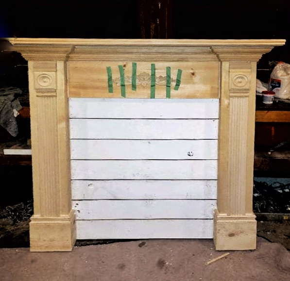 We were putting this in our bedroom, where our wall color was a shade of blue. I wanted to make the faux fireplace mantel surround look more complete, so we added white shiplap so the blue walls wouldn’t be seen through the opening.