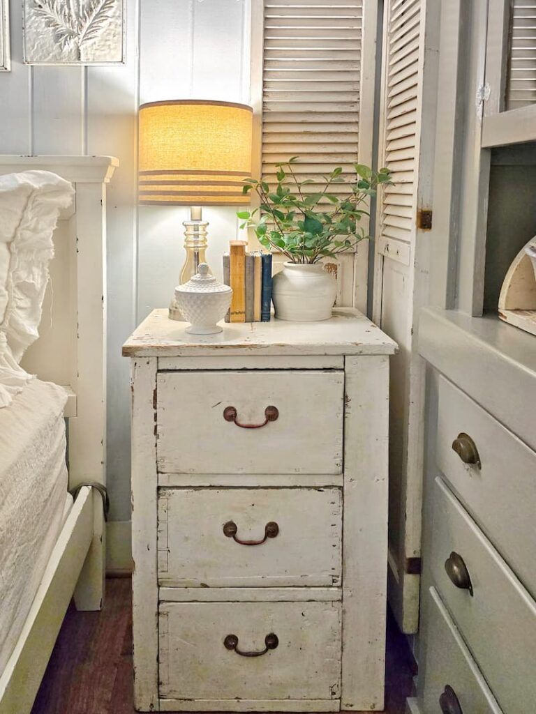 We have a lot of vintage pieces in this room, including this nightstand and shutters.