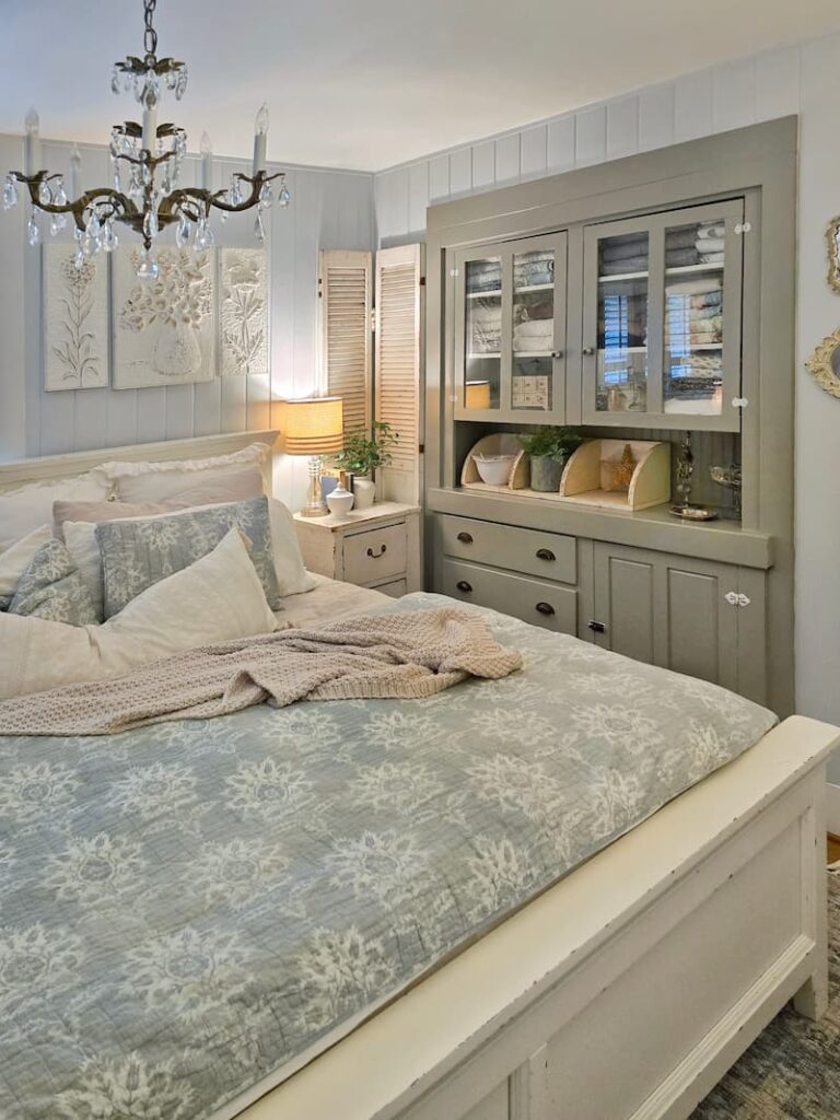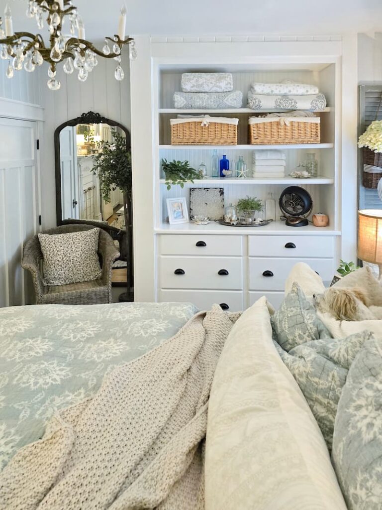The pale blue and white print comforter and shams were from Pottery Barn years ago. I love using them during the summer months.