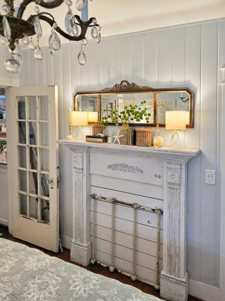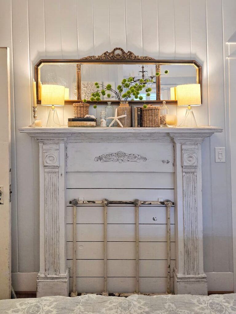 This faux fireplace mantel surround, built by my husband, is one of my favorite pieces. It doesn’t take up much room but gives me just enough space to show off my seasonal decor.