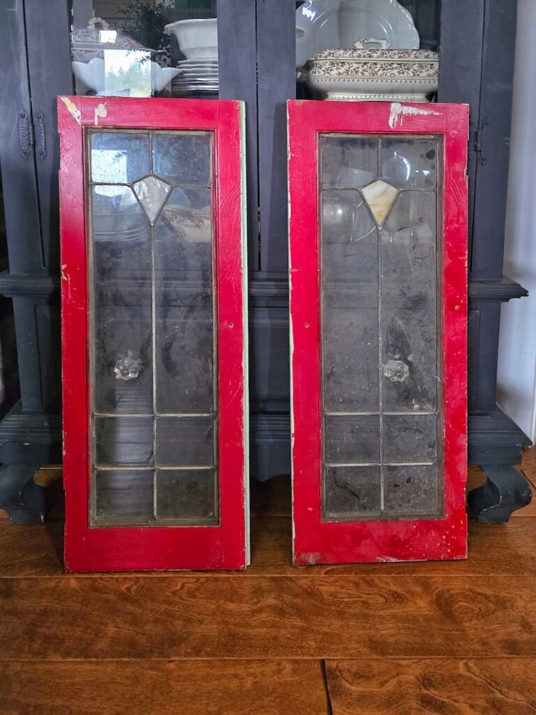 I also scored this beautiful set of vertical leaded glass windows for $20. You know I’ll be painting them. Now I just need to decide on a color. Any ideas?