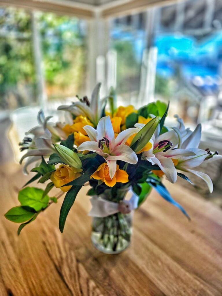 A friend brought me a bouquet of gorgeous lilies and yellow tulips.